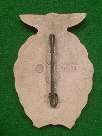 Initially struck in recognition of an early clash with the communists this badge was raised to party status after Hitler's accession in 1933. This example is of the 2nd design being an oval shape, pinback, of solid aluminium construction with an RZM and a maker of M1/35 to the reverse. Finished has dulled with some light oxidisation to recesses. Good example.