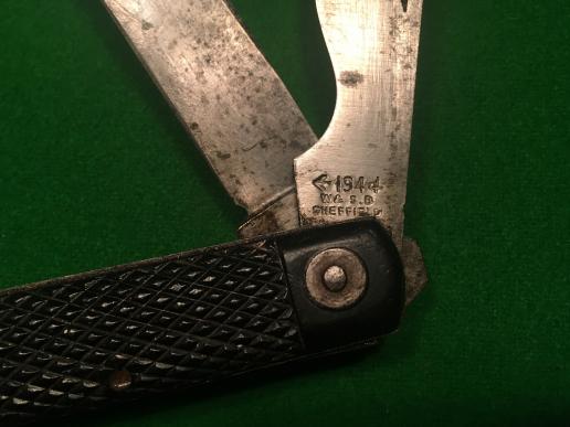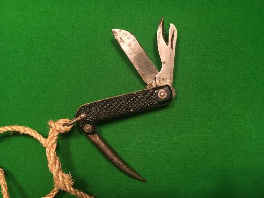Standard issue British Army jack knife with issue lanyard. Dated 1944 and manufacturer marked ' W&S.B.Sheffield ' to can opener blade. Blade patinated with signs of light sharpening, good, overall condition.