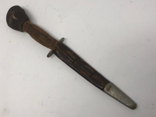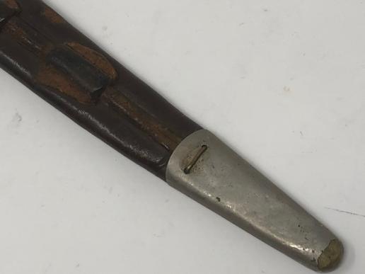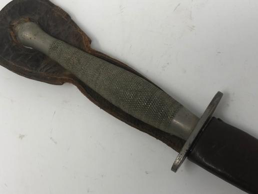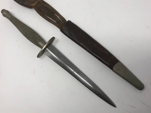 A good example of what seems to be a Wilkinson FS knife (not marked). Blade is a modified 1st Pattn type which they used on the early 2nd. knives. Riccasso has been factory shortened and ground down leaving the little 'triangle' at the top near the crossguard. An almost identical example of this is shown in the FS knife book. Heavily nickel plated grip etch which has the machine chequered finish. Crossguard is stamped with WD arrow and numbers '58' (could be 56) Blade is clean and tidy but has seen use and tip is a little blunt. Scabbard is in good order. Been modified a little at the top to accommodate the ball pommel. Nothing remains of the elasticated strap. Leather is all very supple. Scabbard body is brown and remains of leg tabs are there. Bottom scabbard chape is a 1st Pattn type and is affixed by a staple. Overall a very decent example of early 2nd Pattn.
