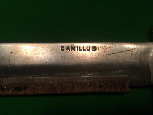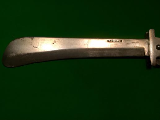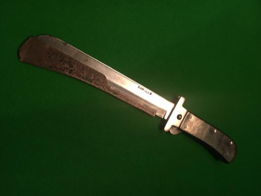 WW2 U.S. folding survival machete as issued to the U.S.A.A.F. Introduced in 1942 and used in the B4 survival kits this example was manufactured by Camillus and features a 25cm blade and retains the oft missing blade cover. Subsequently adopted and manufactured for the RAF. Good, used condition.