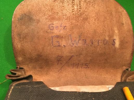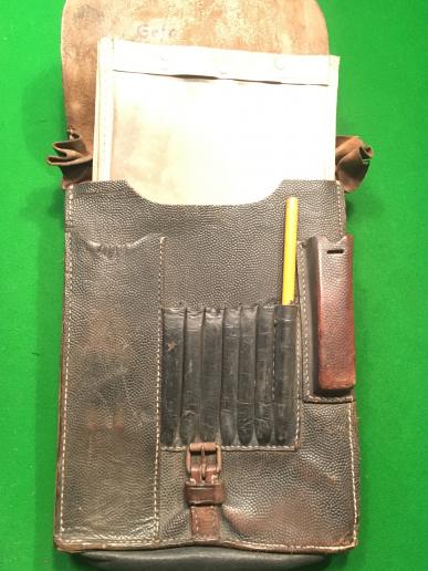 M35 Map/Dispatch case in good condition with all stitching intact, both hanging straps and little wear to the pebbled black leather. Interior flap has details of owner and unit. Unusually the case still retains the leather edged celluloid map cover enabling use of a chinagraph pencil, case is manufacturer marked and dated 1938. Also retains original pencil.