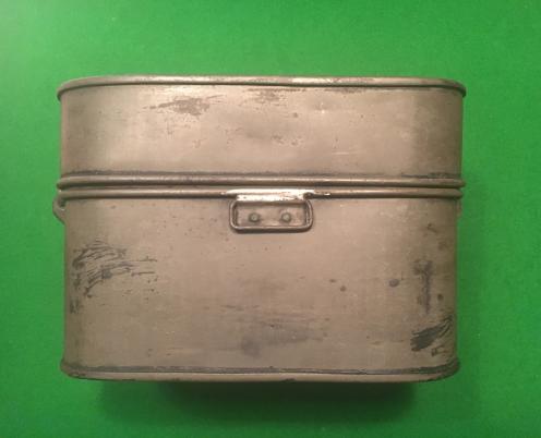 A good condition, well used ' D ’ shaped mess tin, blackened from use. This example retains strap loops to front and reverse.