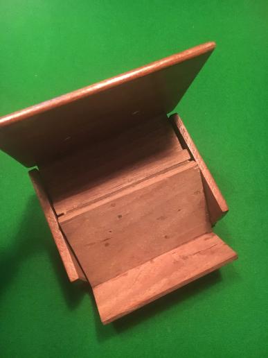 Hand made wooden cigarette box with an ingenious opening system that ' presents ' the contents. The lid is adorned with a second pattern, alloy Luftwaffe eagle with fine detailing. An item typical of the handicrafts produced by troops with time to kill. Good, clean condition.