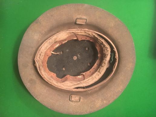 The liner, although substantially intact, has suffered a failure of stitching for approx 50% of the headband and is also missing most of it's adjustment strings. The leather strap is missing although both retainers remain. The shell has one significant impact dent with a deformation of the rim in close proximity with approx. 50%+ of the shell covered by one or more of various coats of paint. Whilst not in excellent condition, it still remains as an example of a unit identified officer's helmet.