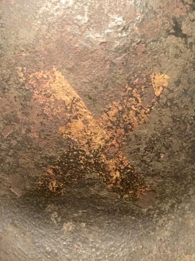 WW1 rimless Brodie pattern helmet with an officer's private pattern liner and unit markings to front and rear. Shell stamped to the reverse ' D/O 43 ' indicating manufacture by J. Dixon & Sons Ltd of Sheffield from plate supplied by S. Osborne & Co Ltd of Sheffield, batch number 43. An officer's pattern, private purchase liner has replaced the Brodie pattern liner. The outer shell seems to have had three individual coats of paint but leaving two yellow ' X ' s to front and rear. Although there are a number of units that used this symbol the specific dimensions of the ' X ' are those set down for 167 Machine Gun Company.