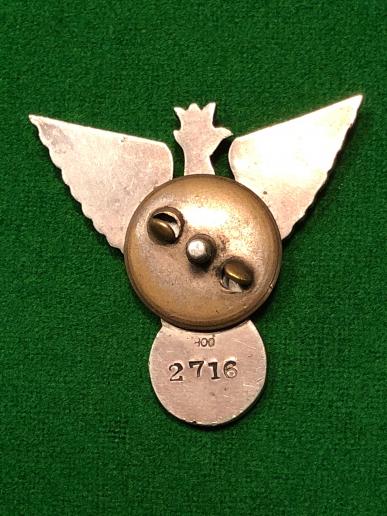 Good example of the Polish Army Silver Tobruk Badge presented to members of the Independent Carpathian Brigade (SBSK), then part of 3 Carpathian Rifles Division. Numbered ' 2716 ' to the reverse with an ' 800 ' stamping indicating silver content. Screw post fixing to reverse with silver plated brass spinner fastening. Good, used condition with some minor abrasions.