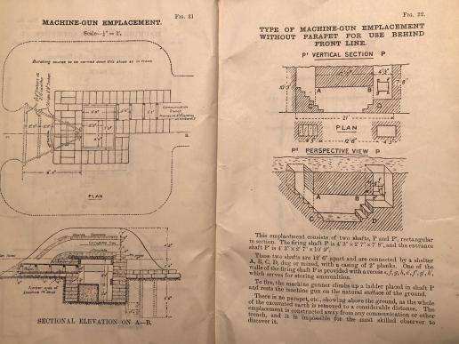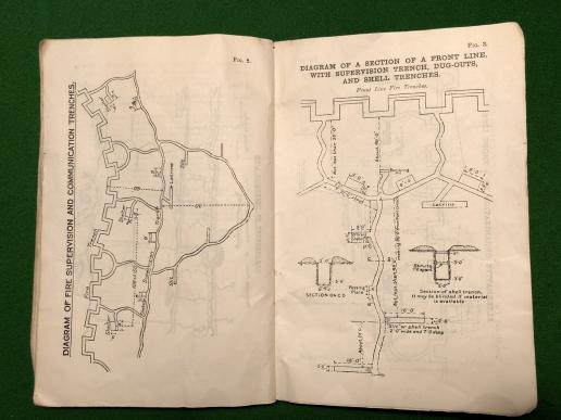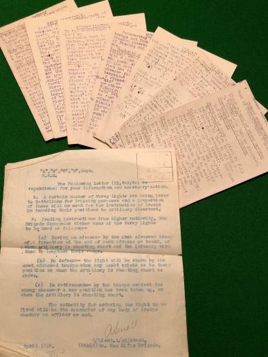 1916ed. ' Notes for Infantry Officers on Trench Warfare '. 72pgs with 30 separate diagrams outlining everything from the construction of dug-outs, MG emplacements, trenches to barbed wire entanglements. Goes on to give advice on daily trench activity as well as expectations in attack and defence. In good, used condition marked ' Adj.11th( Service ) Bn. Rifle Brigade. ' to front cover and some marking and staining, otherwise an excellent overview of the the thinking on trench warfare in 1916. Also comes with an aide memoire typed onto cards and a March 1918 memo concerning the use of Very lights within the battalion.