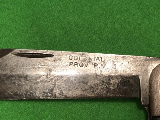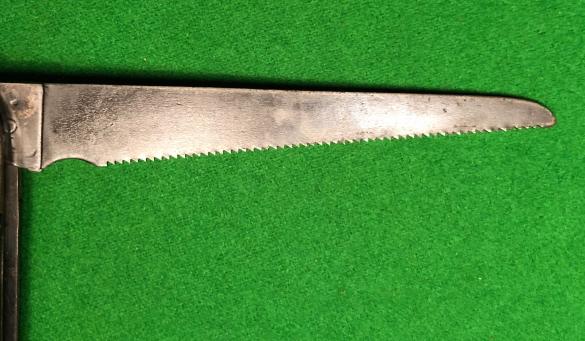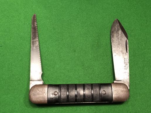 A two-bladed survival knife with 5" Cutting, 5" Saw blades. Manufactured by The Colonial Cutlery Company, Prov, Rhode Island with details stamped to the knife blade. Measuring approx. 15cm closed and 27cm with the knife blade extended. Black plastic grips and blued metal finish. These were placed in pocket No. 3. of the C-1 Emergency sustenance / survival vest as used by USAAF aircrew.