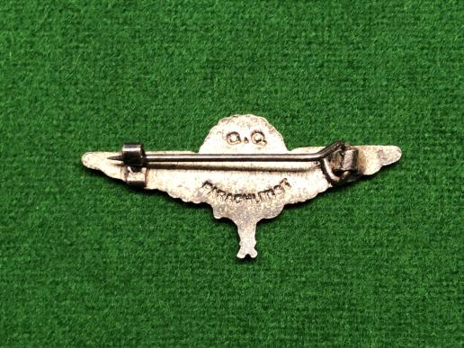 Die struck, silvered and enamel pinback badge for the GQ parachute company. These badges were awarded by the company and were worn variously by parachute packers and company employees. The badges awarded to users of the GQ parachutes have the word 'parachutist' engraved to the reverse.