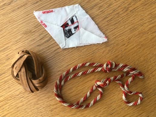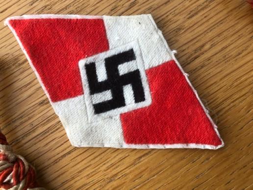 A little grouping of HJ stuff I purchased from a contact in Vienna. He seems to find a lot of Hitler Youth insignia and accessories. I very nice HJ 'bevo' diamond, which has obviously been removed from something. These were used on the HJ sports vests and also worn on the left arm of the DJ and BDM jackets. Very nice used condition, folded to shape, marked Ges Gesch on reverse. Secondly is a HJ scarf 'woggle'. This leather woggle was used on the HJ neckerchief worn with the HJ shirt etc. In woven beige leather.(our cubs and scouts have/had a similar thing). Lastly a HJ rank brassard in red and white twisted cord. Goes over the shoulder and into the top pocket.