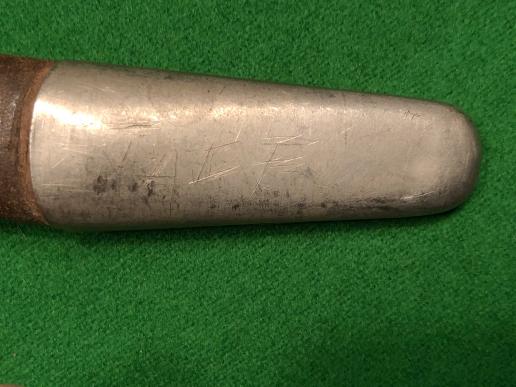 An example of the so called ' Fat Man ' variation of the 2nd Pattern F.S. Fighting knife. This variant is distinguished by it's wider handle cross section and has been tentatively linked to the firm of J.Clarke & Son. This example features a blackened grip with a broad arrow 2 inspection mark and wear to highpoints. Originally blackened all over, the blade is now bright and shows signs of both sharpening and cleaning but retains both it's length and point. Contained in an early 2nd patt. scabbard featuring nickel chape which has owner's details ' Taff ' scratched into it's surface, a name repeated to the reverse of the scabbard. The scabbard is in good, well used condition with seperation of the elastic retainer. A good, used example of a scarce variant.