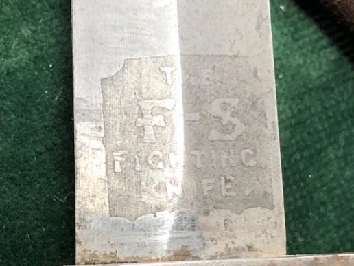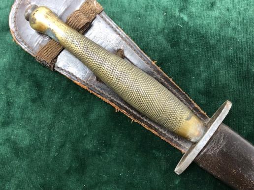 A good, untouched example of the 2nd Pattn. FS knife by Wilkinson Sword. Brass chequered grip, oval steel crossguard, all never been apart. Very good brown leather scabbard. Original elastic strap still present. Scabbard body not damaged or split. Lower chape with single brass rivet fitting. Both leather 'tabs' removed at the time. Blade is pointed stiletto type appears unsharpened. No pits or damage to edges. 'Wilkinson Sword' makers mark etched on one side of the blade riccasso, and 'The FS Fighting knife' etched onto the opposite side.