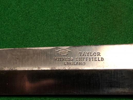 Double-edged,hand drawn, spear-pointed diamond-section blade, brass metal oval crossguard and swollen grip consisting of alternating bands of leather with brass and brass pommel. Blade stamped "[eye] WITNESS TAYLOR SHEFFIELD ENGLAND" with clear signs of cross graining with some light marking .Simple tan leather sheath with 7 brass rivets, integral frog with incised belt loop stamped ' made in England '. Retaining strap now broken.These knives were often seen being used by Commandos and were popular purchases for US servicemen.