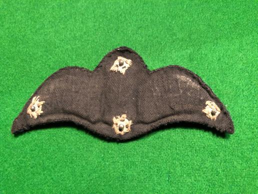 A good, clean example of a padded RAF Pilot wing, probably for use in tropical climes. Oatmeal coloured thread on blue wool with good definition to the feathers of the wing backed with black cotton onto which four pop fasteners have been sewn allowing for easy removal. Individual padding segments give good relief to wing. Good example with some signs of light use.