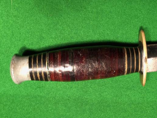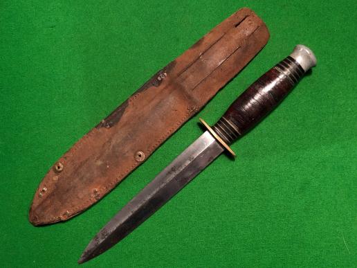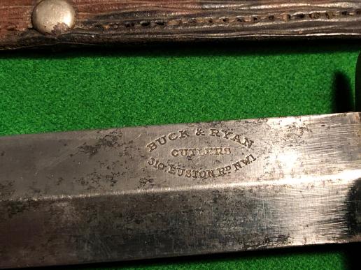 Double-edged,hand drawn, spear-pointed diamond-section blade, brass metal oval crossguard and swollen grip consisting of alternating bands of leather with brass and brass pommel. Blade stamped " Buck & Ryan Cutlers 310 Euston Rd N.W.1" with clear signs of sharpening and staining . Simple tan leather sheath with 9 brass rivets, integral frog with incised belt loop. This example is identical to item ( 8099 ) and was probably made for Buck & Ryan by Taylors of Sheffield.These knives were often seen being used by Commandos and were popular purchases for US servicemen from the large retail premises of Buck & Ryan who still trade today having moved from Euston Rd to Southampton Row.
