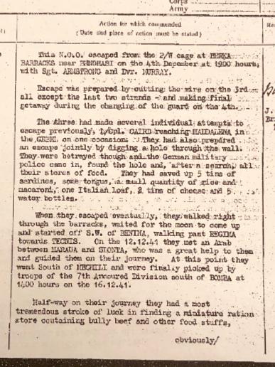 In an epic march of 240 miles across the desert the three displayed great courage and determination and were aided by their meeting of an Arab a week into their journey giving them directions and informing of enemy movements. Further good fortune came in the locating of a small ration store. They finally met up with troops of 7th Armoured Div South of Bomba where they were able to give valuable information and intelligence. All three were decorated with the MM.