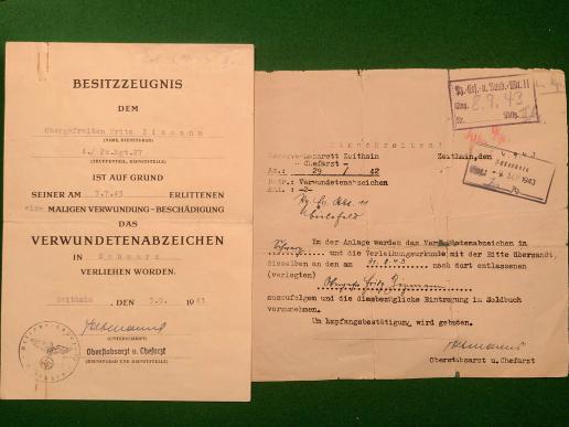 Zizman's Soldbuch indicates that he was awarded the silver PAB, EKII, Russian Front Medal and the Black Wound Badge. He served with Pz.Regt.27 which operated as part of 19 Pz.Div spending his time on the Russian Front . He was wounded by shrapnel on 03.09.43, probably in operations with KG Becker near Belowskaja .Interesting grouping accompanied with a small amount of research.