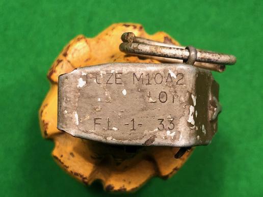 An excellent example of the classic US ' Pineapple ' grenade. This example is a Mk.2A1 introduced from 1944, essentially very similar to the M2, the Mk2A1 is distinguished from it's predecessor by the absence of a filling hole to the base. This is an early version, still retaining its yellow colour, most Mk2A1s being green painted. Accompanied by the correct M10A2 igniter with which the initial powder filled grenades were issued. Excellent example of wartime grenade.