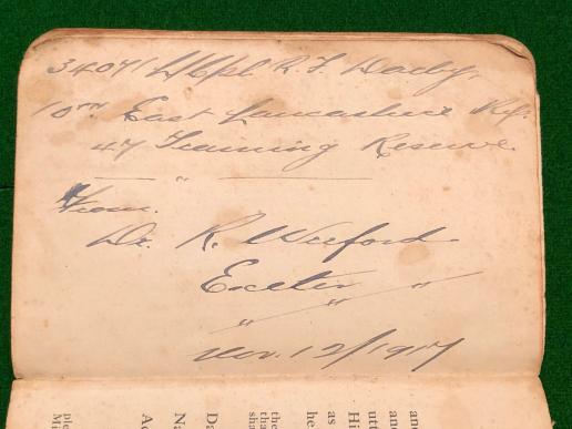 Standard ' issue ' Active Service Testament for 1917 with ownership details for 34071 L/Cpl.R.F.Hardy - 10th East Lancs Regt , 47th Training Reserve. In used, well thumbed condition and missing the frontispiece but otherwise intact. Ownership inscription to last page.