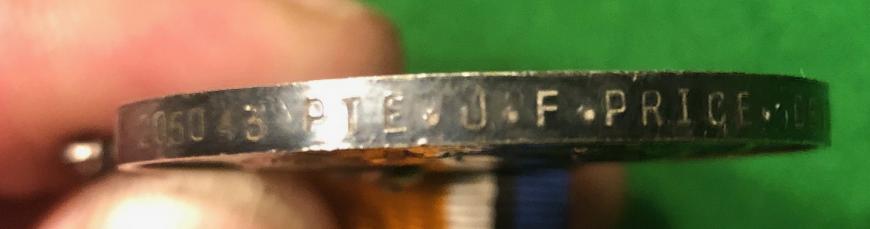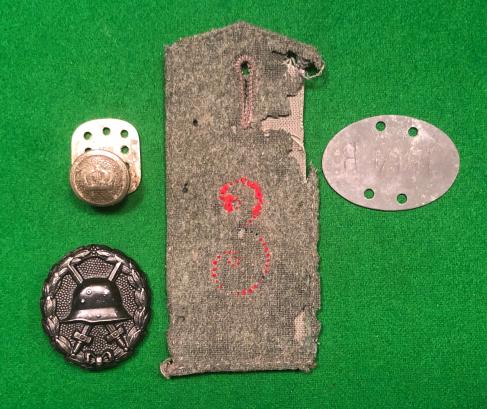 A small grouping of medals and souvenirs from the service of 205043 Pte.James.F.Price Devonshire Regt. Grouping includes War and Victory medal pair, officially impressed with the above details, Devonshire Regt, brass bedplate with Price's details and a different service number, an identified photograph of Price, brass skill at arms badge and dogtags. Also included are a number of WWI German items presumably souvenired by Price including a badly M15 shoulder board, a dog tag, black wound badge and a rear tunic belt support button. Interesting grouping with MIC details.