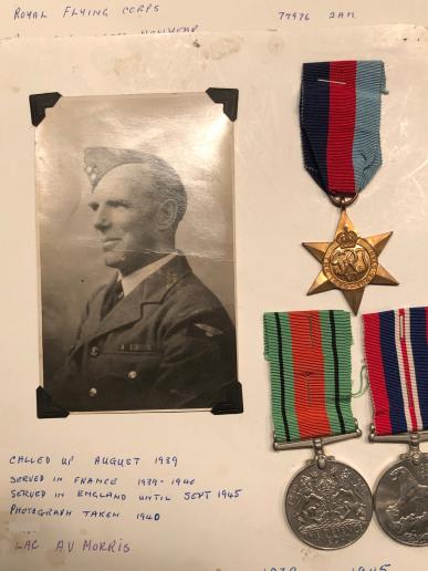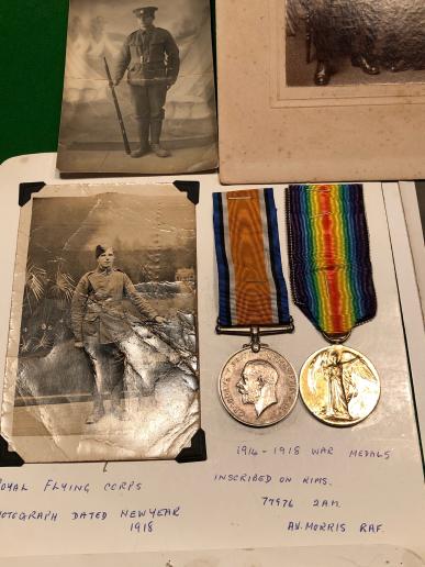 Grouping of medals and photographs showing the service of A.V.Morris in two wars and different services. Morris appears to have served in the Shropshire Yeomanry before transferring to the RFC and subsequently the RAF and then called up to the RAF again in 1939. War and Victory medal pair impressed 77976 2.A.M.A.V.Morris with the 39-45 Star, Defence and War medals unnamed as issued. Most items are mounted on card as what appears to be a display with most photographs identified to reverse. accompanied by other loose photographs. Unresearched.