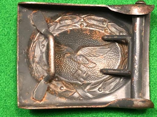 Die-struck steel Luftwaffe O/R's belt buckle. Second pattern eagle example with no manufacturer's marks but featuring 85% of it's original blue finish. Wear to highlights and some very light corrosion to reverse.