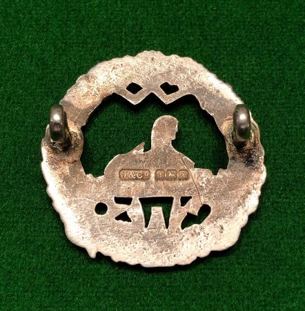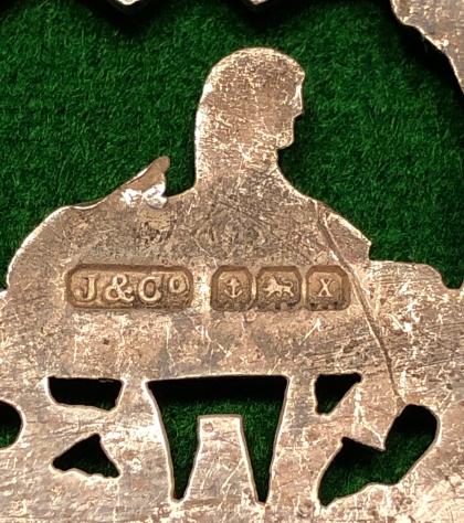 Hallmarked silver South Wales Borderers Officer's cap badge. Cast silver with long lugs and featuring hallmarks for Birmingham 1923 and the makers marks for Jennens & Co. Good, clear detail, patinated overall.