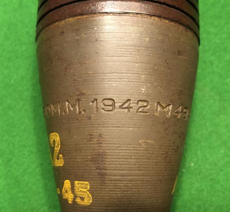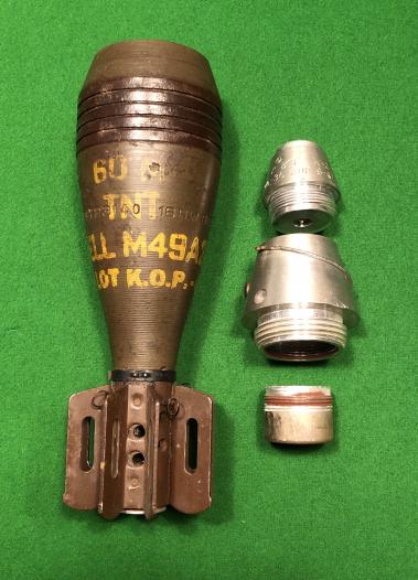 An excellent example of a 1942 dated US 60mm M49A2 mortar round for use with standard US infantry 60mm M2 Mortar. This particular example retains 98% of it's original paint finish with stencilled filling information. 1942 dated, aluminium bodied fuze retaining safety wire. Also retains inert propellant cartridge. Excellent, clean example.