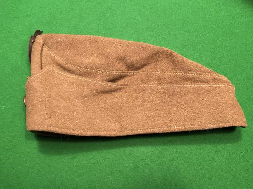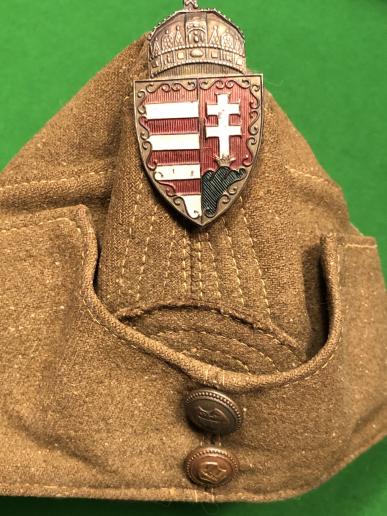WW2 period Hungarian Army Field Service side cap. Heavy khaki material with turn down flaps and false peak topped with a bronzed and painted shield bearing the Hungarian national symbol and closed with bronzed buttons bearing Hungarian shield. Liner has been constructed from different types of cotton presumably as an economy measure. In excellent, used condition with the body of the cap being worn with clear lack of wear when flaps are turned back. Liner shows clear sign of wear, moth free. Uncommon item.