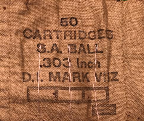 1043 dated cloth bandoleer for carrying 50 rounds of MkVIIZ .303 ammunition. Clearly marked with nomenclature, Canadian WD marking and dated, in good used condition with some light staining. POSTFREE within UK