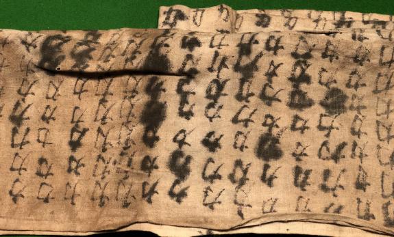 Rather than receiving its power of protection through a thousand stitches, the senninriki acquired good luck by the use of a thousand chikara or power ideograms. This power is enhanced by the stitching of a coin to the centre. Measuring approx 140cms in length, this example was decorated in ink on a sheet of cotton and then folded in half to form a belt or winding, one end has a representation of the rising sun containing another exhortation or maybe a name. Shows clear signs of use, being stained and grubby but otherwise good condition. Less common than senninbari or thousand stitch belts.