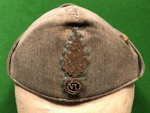 Quality WW2 Italian officer's Bustina for an officer of the rank of 2nd lieutenant in the VI Grenadier Regiment. Fine sage green cloth body with ear flaps retained by snap fasteners with bullion rank and regimental insignia. Blue silk lining with leather sweatband with a fold out peak, again retained by snap fasteners which shows fresh colours which is in contrast to the body which displays wear and slight fading. Manufacturer's details were probably present under a celluloid diamond in the lining crown, now absent. An excellent example of a bustina displaying various features which were expensive options at the time.