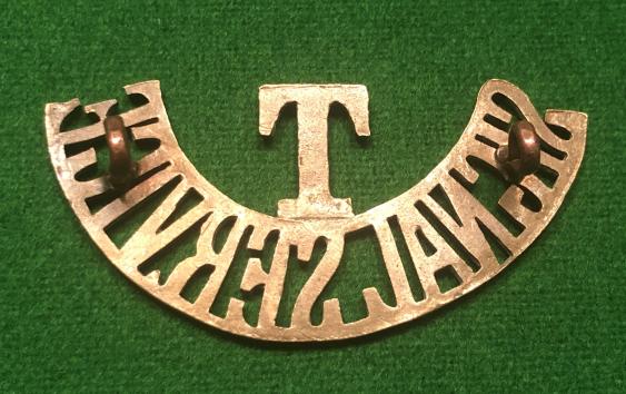 A good WW1 brass shoulder title to the Territorial Signal Service Royal Engineersl . Worn by Divisional Signal Companies and Infantry Brigade Signal Sections. Two loops to the reverse.Good, used condition and uncommon. Ref.Westlake 548/9