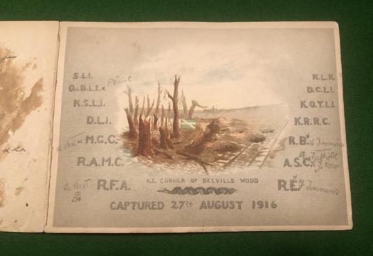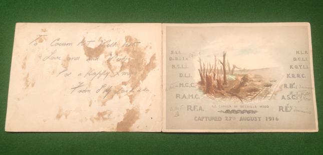 1916 14th ( Light ) Division Christmas Card featuring a watercolour view of Delville Wood. Published by Tuck & Sons and showing evidence of having been removed form an album. POSTFREE within UK