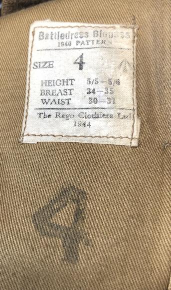 1940 Patt. Battledress blouse for a Major of the Intelligence Corps. Manufactured by the Rego Clothiers Ltd in 1944 this example is a size 4 with good, clear label and inspection marks to the interior.In excellent, clean condition with some minor moth grazing. Featuring printed Intelligence Corps shoulder titles and Major's crowns embroidered on green backing indicating Intelligence. A good example.