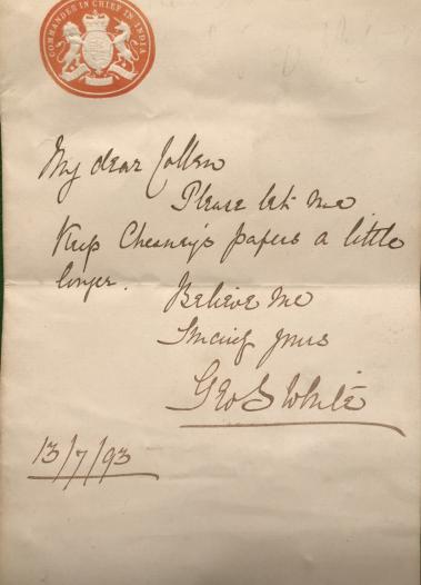 Portrait unframed and is artist signed and dated 1900,some minor making and chipping. Accompanied by an 1893 note on CinC India headed notepaper signed by White.