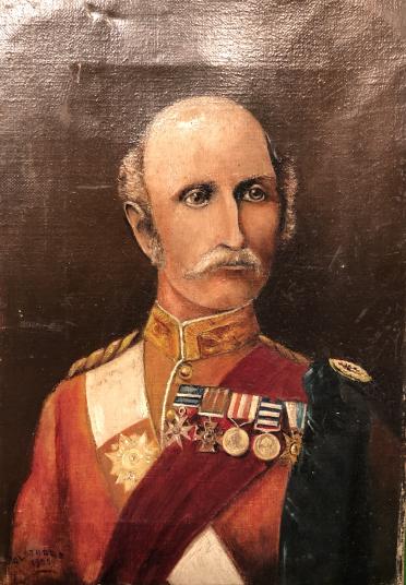 18cms x 25cms original oil on canvas portrait of Field Marshal Sir George Stuart White VC, GCB, OM, GCSI, GCMG, GCIE, GCVO (6 July 1835 – 24 June 1912). ' Stationed at Peshawar during the Indian Mutiny and then fought at the Battle of Charasiab in October 1879 and at the Battle of Kandahar in September 1880 during the Second Anglo-Afghan War. For his bravery during these two battles, he was awarded the Victoria Cross. He went on to command a brigade during the Third Anglo-Burmese War in 1886 and became commander of Quetta District in 1889 in which role he led operations in the Zhob Valley and in Balochistan. He was commander of the forces in Natal at the opening of the Second Boer War and fought at the Battle of Elandslaagte in October 1899. He commanded the garrison at the Siege of Ladysmith: although instructed by General Sir Redvers Buller to surrender the garrison he responded "I hold Ladysmith for the Queen" and held out for another four months before being relieved in February 1900. He finished his career as Governor of Gibraltar and then as Governor of the Royal Hospital Chelsea.'