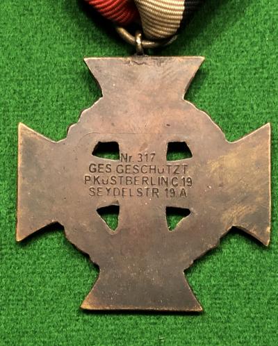 Bronzed, brass cross with manufacturer's details to the reverse with attached ribbon in German national colours, all in good condition.