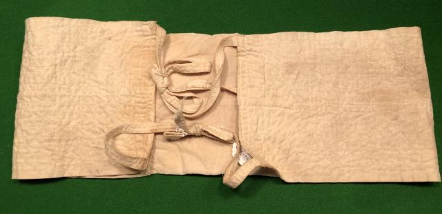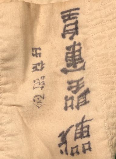 A classic example of a WW2 Japanese Senninbari with the symbolic ' 1000 stitches ' taking the form of a rising sun, the Japanese Imperial flag, in a central panel of the cotton belt. Belt has horizontal lines of stitching reinforcing, and giving the belt an attractive, quilted appearance. Ink characters probably a patriotic exhortation and a name, appear to one side of the stitches. Excellent condition with both ties intact and very light staining from wear.