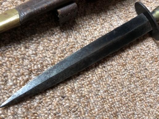 This is a very nice variation example of a 2nd Pattn FS type fighting knife with the 9 segment 'BEADED AND RINGED' cast brass grip. One of a few well known and recognized types offered by different manufacturers as the market grew for these weapons. No identifying marks of any kind. Overall conduction is excellent. The grip was originally blackened but this has worn off mostly, leaving the residue in the grip rings. Blade remains un-sharpened with needle sharp point. There is a little surface discoloration on one side, but most of the original blackening on the blade is intact too.The scabbard is lovely. Supple brown leather, top grip loop with popper works perfectly. Brown leather body is undamaged, bottom chape is also perfect. The 4 leather scabbard 'sew-on' tabs are ALL THERE. Tis exact type of knife is featured in several of the FS fighting knife books. A very good example