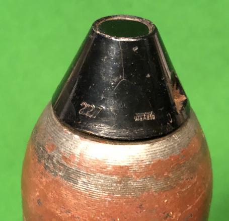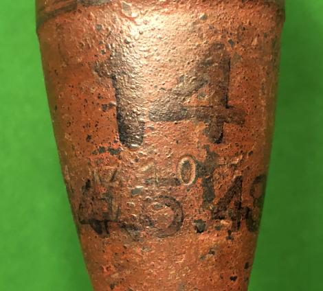 1943 dated German 5cm Light Infantry Mortar Projectile. Original ' red oxide ' finish with stencilled batch and filling date with numerous inspection stamps and manufacturer three letter codes. Plastic economy impact fuze complete with date and manufacturer markings.