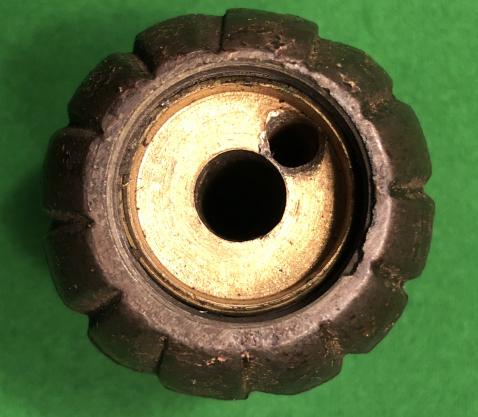 A good example of a British WW1 No5. Mk1 Hand Grenade. Body retains approx. 45% of it's original lacquered finish with no clear markings evident. Fitted with a brass No.5 MkI base plug by D.F.Co. Derwent Foundry Co Ltd.Exeter Place, Derby., this is dated /16. Good overall condition with brass filling plug and detonator pocket. Good, original example.