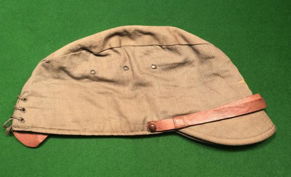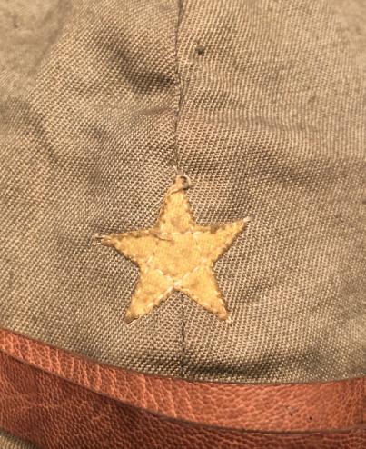 WW2 Japanese Summer weight cap. Khaki, multi-piece, cotton body with reinforced, but foldable peak, leather strap and wool star stitched to front with lace adjustment/fastening to rear body. Interior is lined in white cotton with a leather sweatband, no sign of markings.Excellent and possibly unissued condition, one strap retaining button is missing but strap has been sewn to side. Unusually in my experience, this cap came with other Japanese souvenirs retained by a serviceman's family.