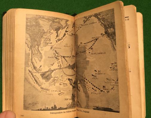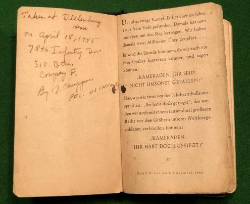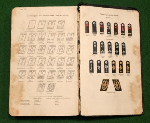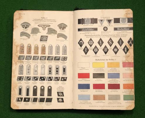 1943 SS Diary and Yearbook, unused. Uncommon example packed with information from the organisation and raison d'etre for the SS to colourful charts depicting the insignia of all arms of the German forces. The unused diary is filled with additional dates of significance in the National Socialist calender. Worn and slightly tired condition, with some staining. Interestingly inscribed by a Pfc. of the 78th Inf. Div as having been picked up in Dillenburg, Hesse on April 18 1945.