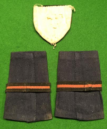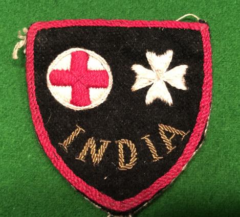 Set of insignia worn by a woman member of the Indian Red Cross and St.John Association. Featuring a typically Indian made sleeve patch with bullion and thickly embroidered cotton details and a pair of shirt/overall shoulder strap slip-ons with embroidered ' I.R.C.& St.J ' title and a ribbon rank sleeve. Good, used condition, unusual.