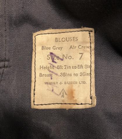 A characterful R.A.F. Aircrew Blouse for a pilot with the rank of Pilot Officer. Size 7 ' Blouses Blue Grey Aircrew ', although not dated it bears the inspection marks indicating manufacture in 1942. P/O rank lace machine stitched to the epaulettes with a pair of deeply padded pilots' wings to the left breast. Tunic displays evidence of being well worn, slightly grubby with heavy wear to collar and cuffs