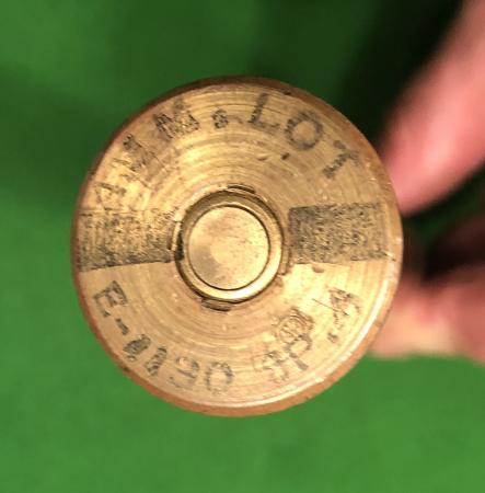 This round was the result of a US project commenced in 1937 to develop a .90 inch machine cannon for aircraft use. This example, a dummy HE with an aluminium dummy fuze, has Lot and calibre markings to projectile body with a profusely marked brass 23x139SR case with markings indicating manufacture by Frankford Arsenal. Good overall condition with original paint and filling ring to projectile, case made inert by the provision of a hole to bottom of case.