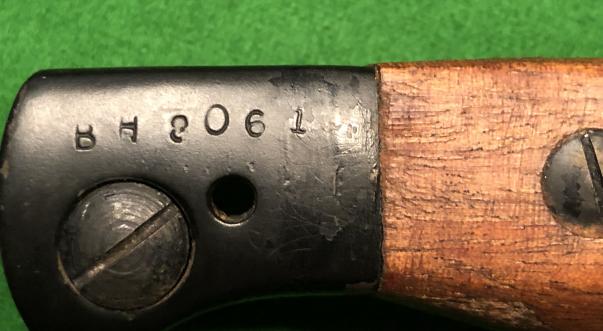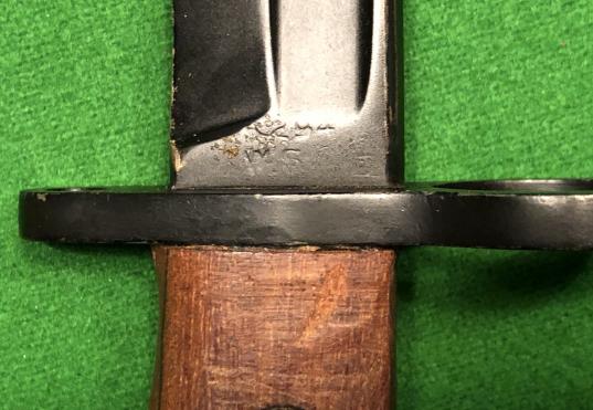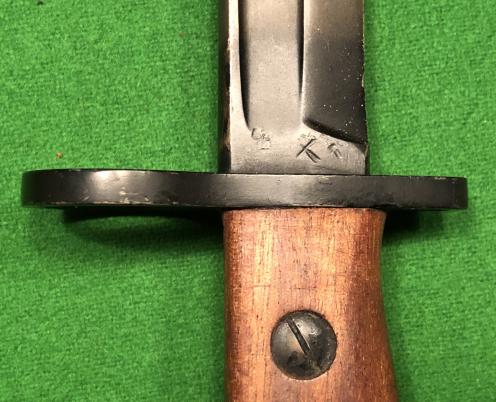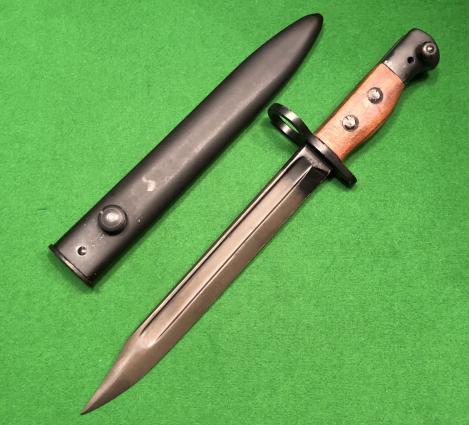 An excellent example of a No.5 Bayonet Mk 1, second pattern designed for use with the No.5 Jungle Carbine. This pattern differs from the first pattern in having two bolts securing the grips as opposed to one. This example comes with a MkII scabbard. Faint manufacturer's marks ' WSC ' indicating manufacture by Wilkinson Sword and serial number stamped to pommel. In excellent, clean condition.