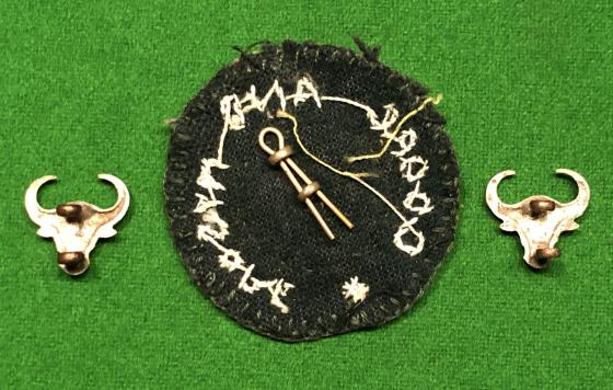 Uncommon set of insignia to the Coorg & Mysore Machine Gun Corps. Comprising an embroidered badge with attached collar which I believe was worn on the sun helmet and two cast white metal collar badges. Part of the Indian volunteer organisation largely formed with European volunteers and in existence between 1917 and 1933.