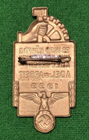 Die-struck, gilded brass tinny produced for the NSDAP labour organisations the DAF and NSBO in 1933 with a quotation from Hitler translated as ' there is only one nobility: the nobility of labor '. Manufacturer marked to the reverse ' Wachtler Mittweid Lange S.A.' Good, clean condition.
